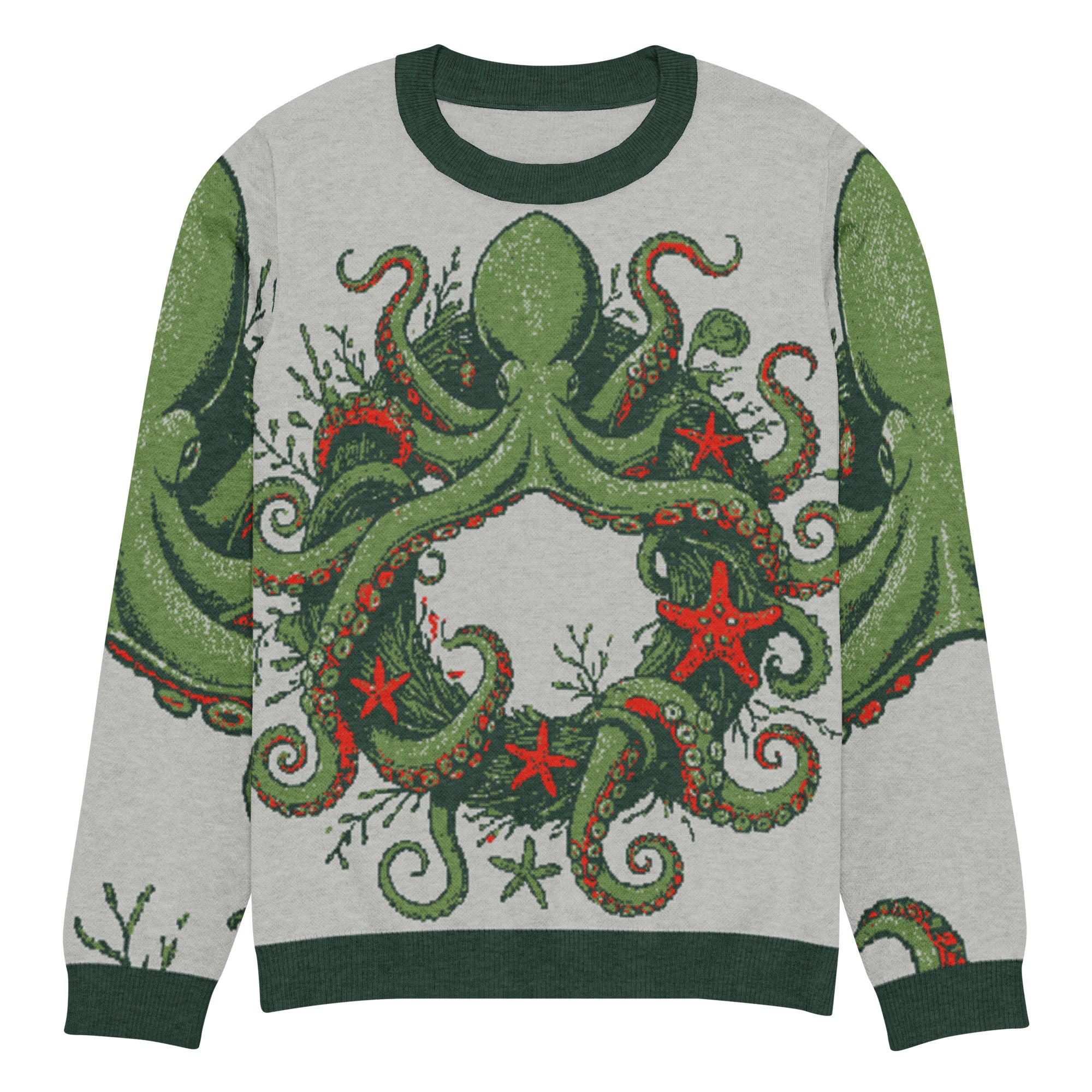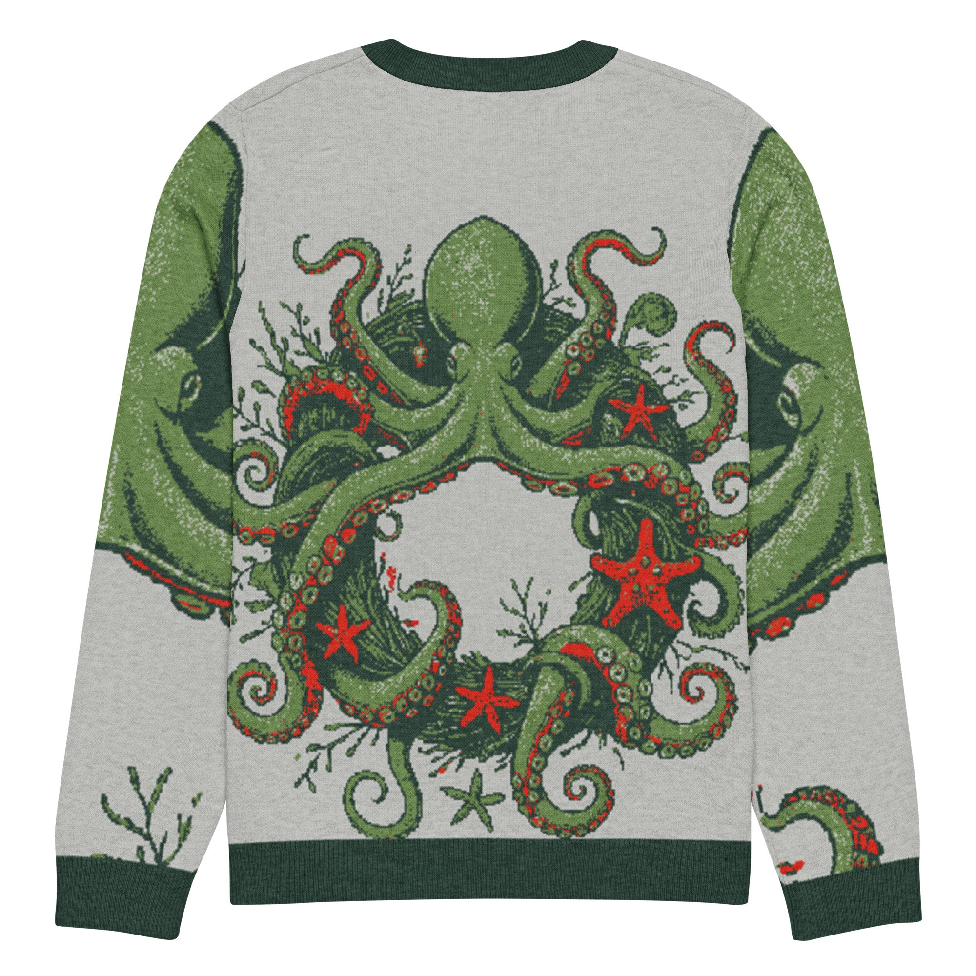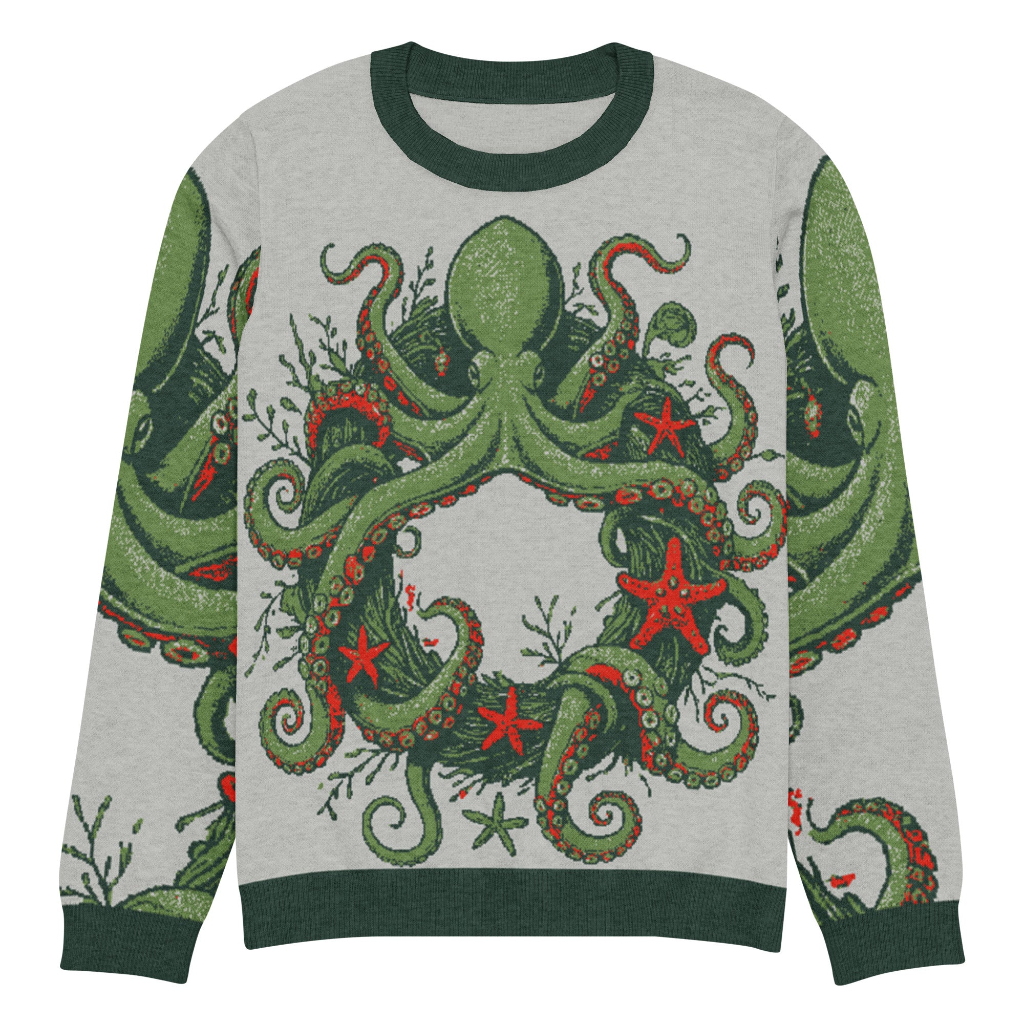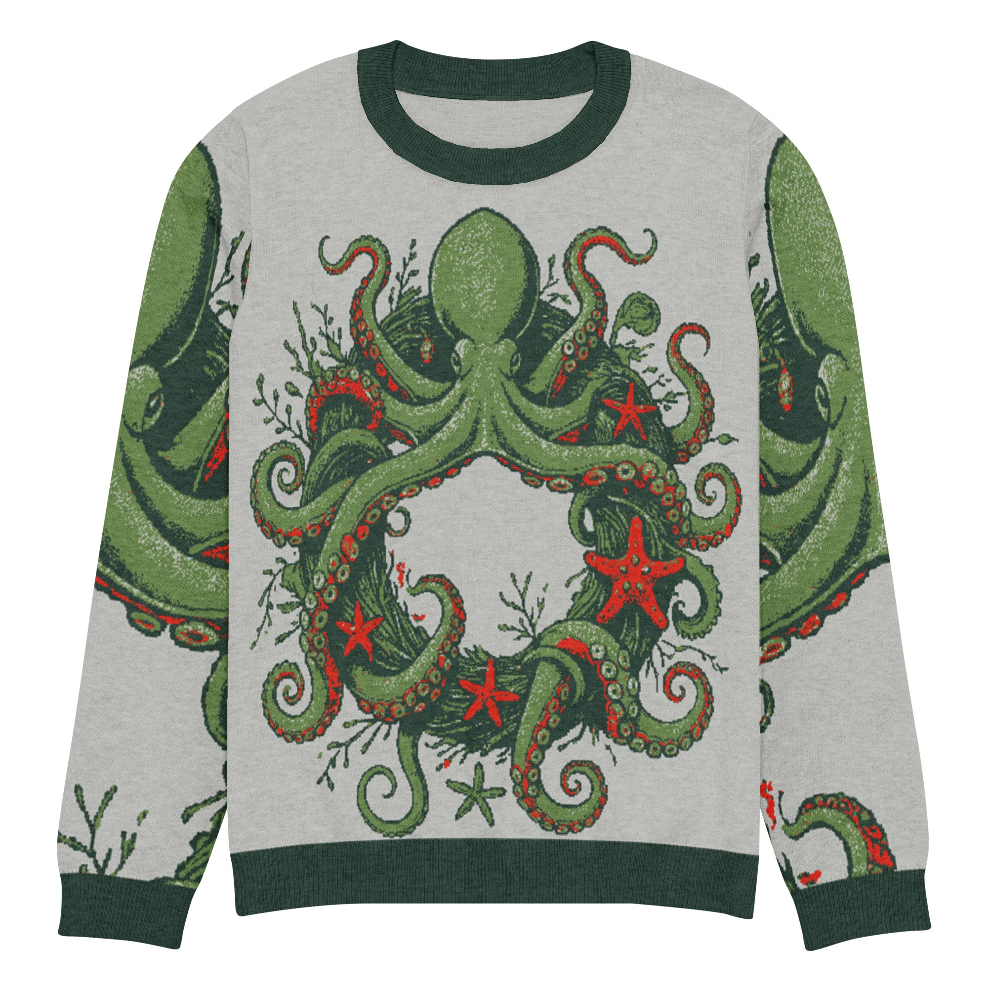 Add a splash of the ocean to your holiday wardrobe with this cozy, eco-friendly Classic Fit Knitted Crew Neck Sweater, featuring a one-of-a-kind Octopus Wreath Design. This unique “ugly¨ sweater showcases a whimsical octopus, whose intricately detailed tentacles wrap tightly to form a festive circular wreath, adorned with kelp, starfish, and sea life. The design's simple yet striking color palette of red, green, white, and blue adds a festive touch, making it the perfect statement piece for the holiday season.