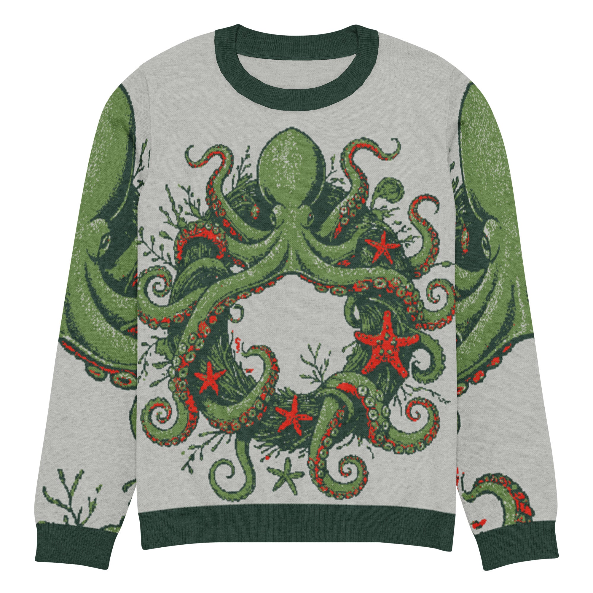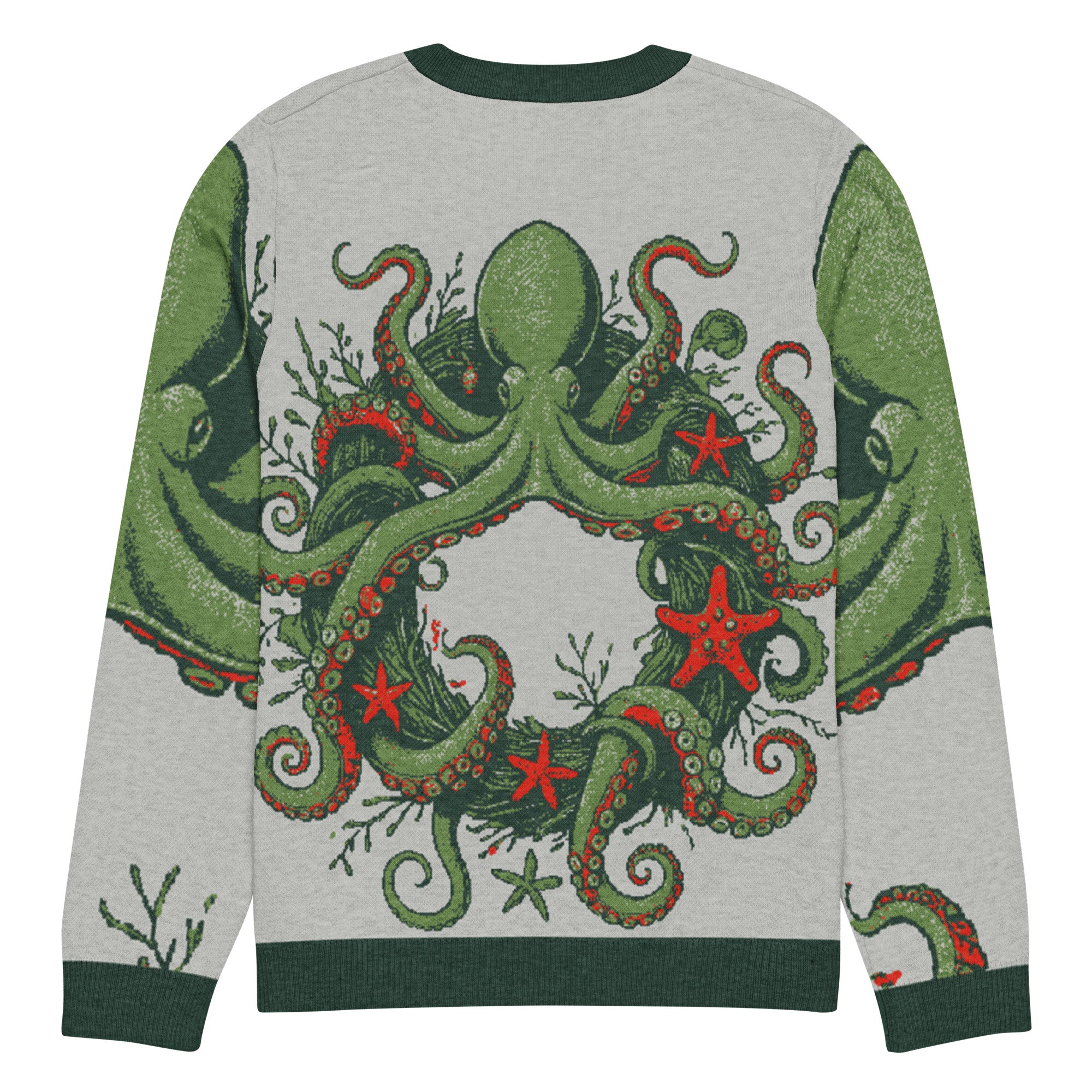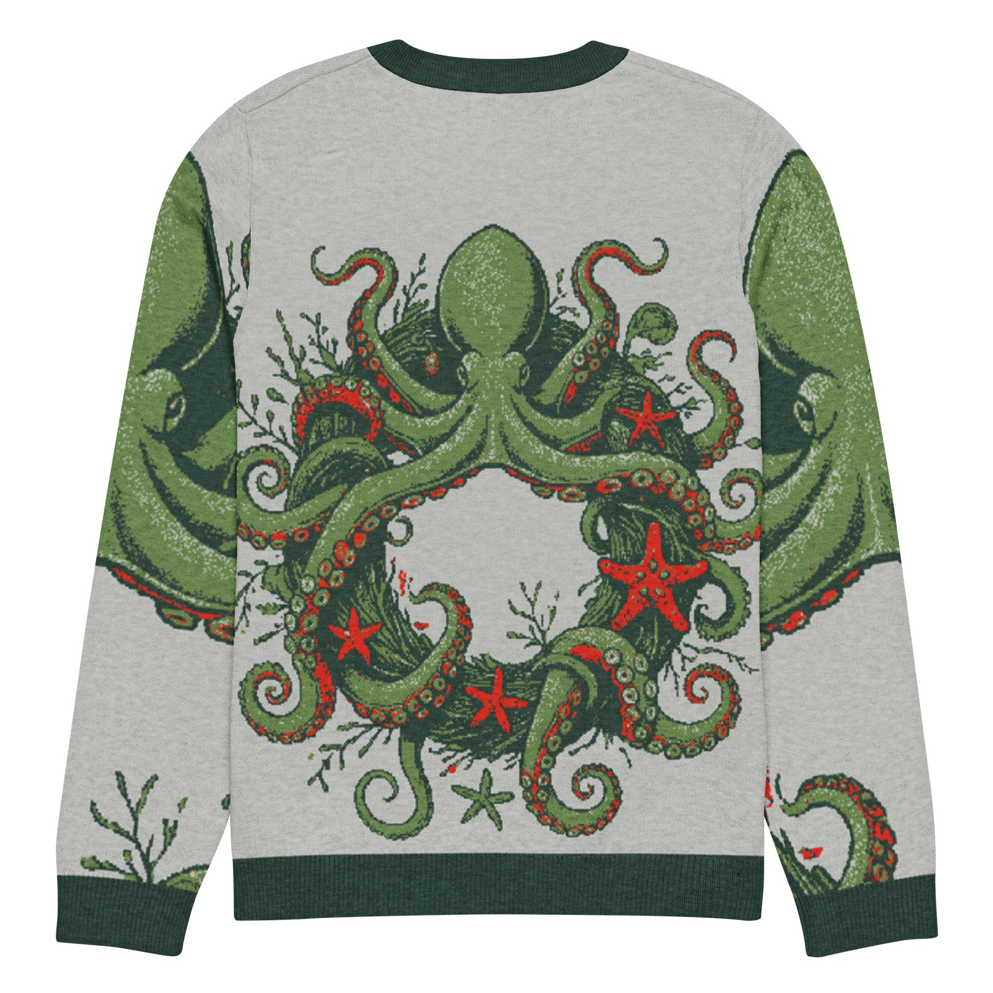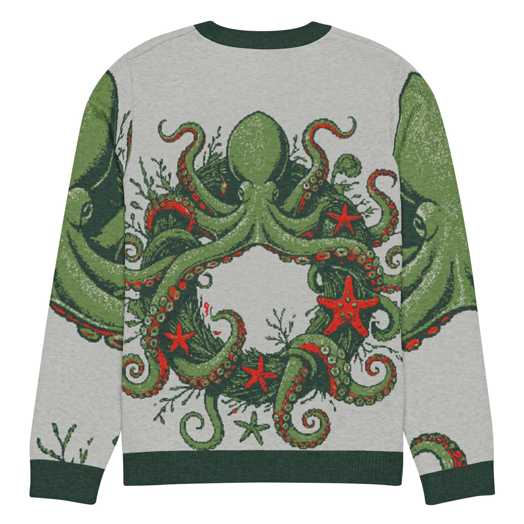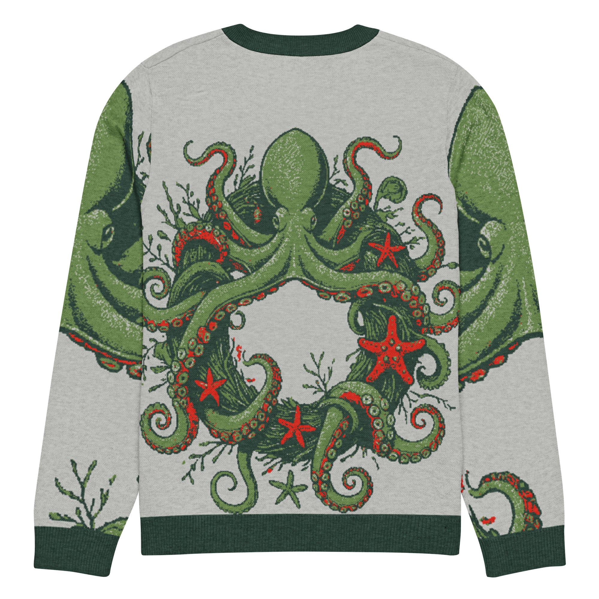Add a splash of the ocean to your holiday wardrobe with this cozy, eco-friendly Classic Fit Knitted Crew Neck Sweater, featuring a one-of-a-kind Octopus Wreath Design. This unique “ugly¨ sweater showcases a whimsical octopus, whose intricately detailed tentacles wrap tightly to form a festive circular wreath, adorned with kelp, starfish, and sea life. The design's simple yet striking color palette of red, green, white, and blue adds a festive touch, making it the perfect statement piece for the holiday season.