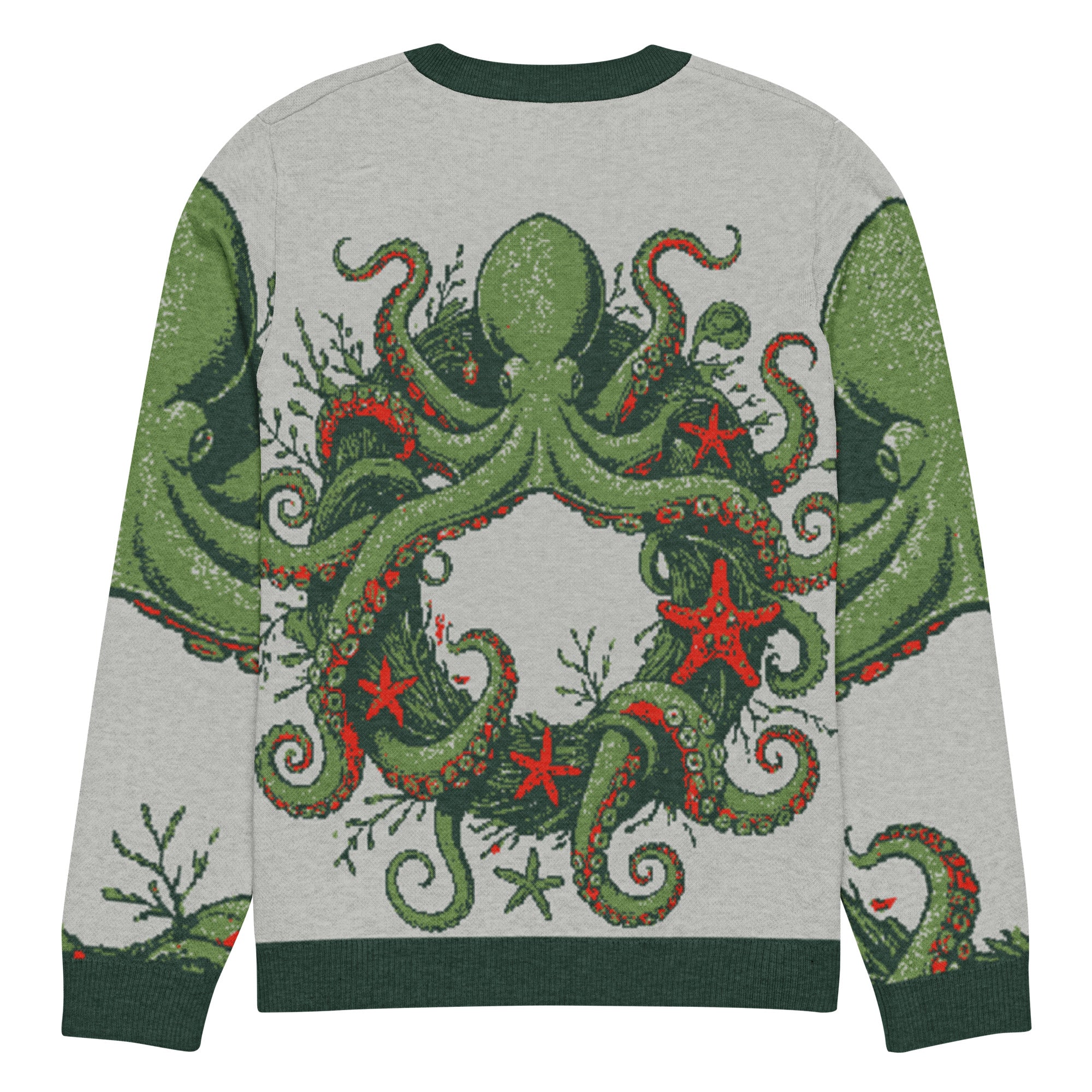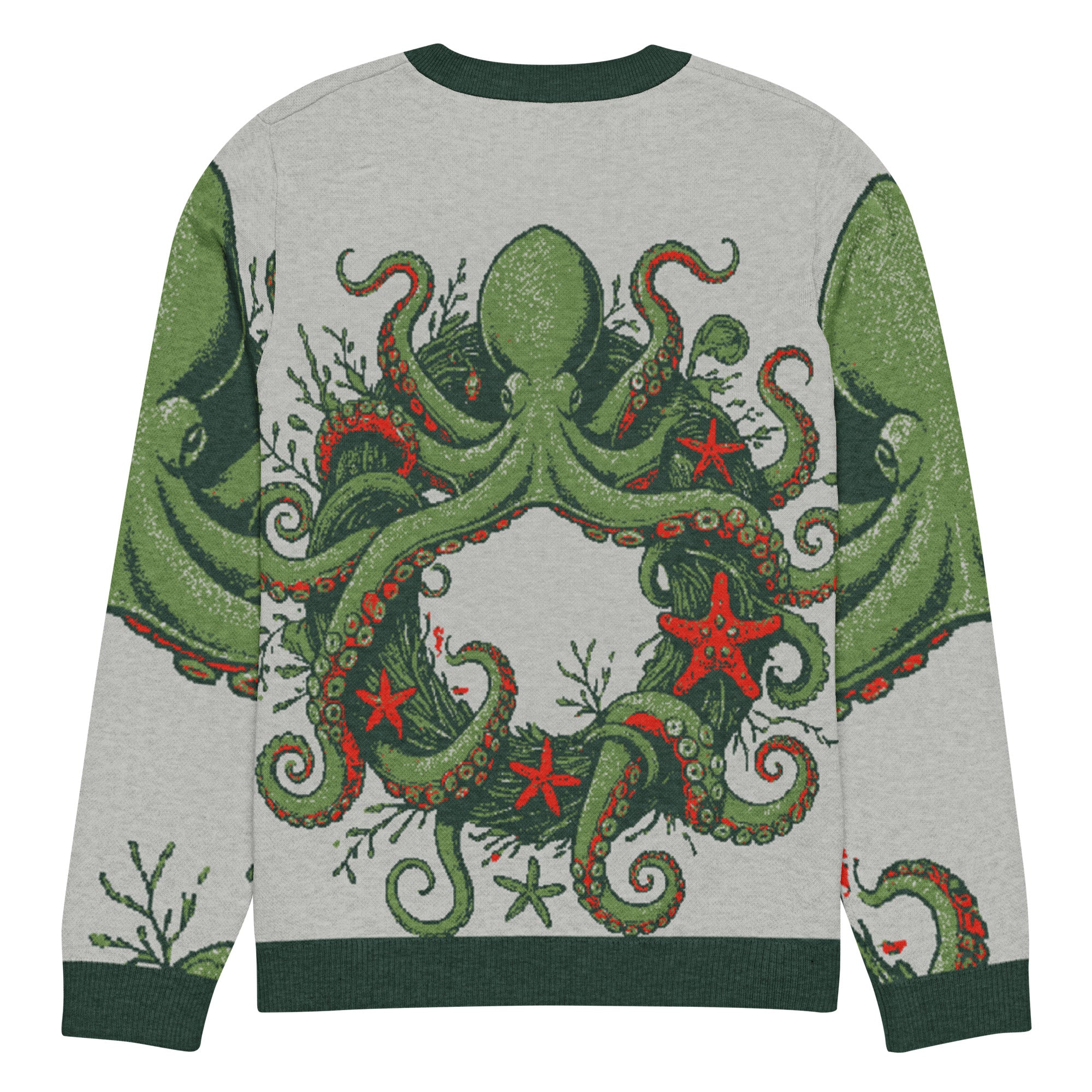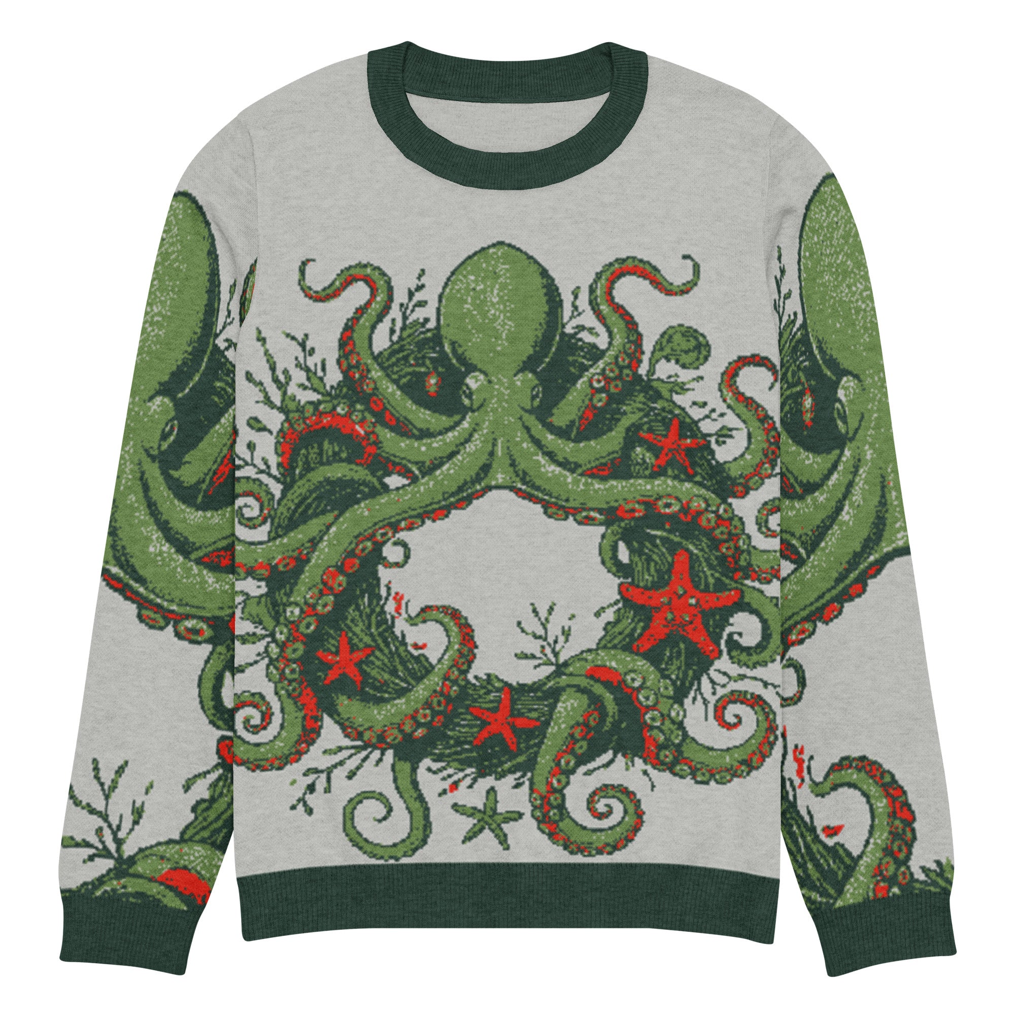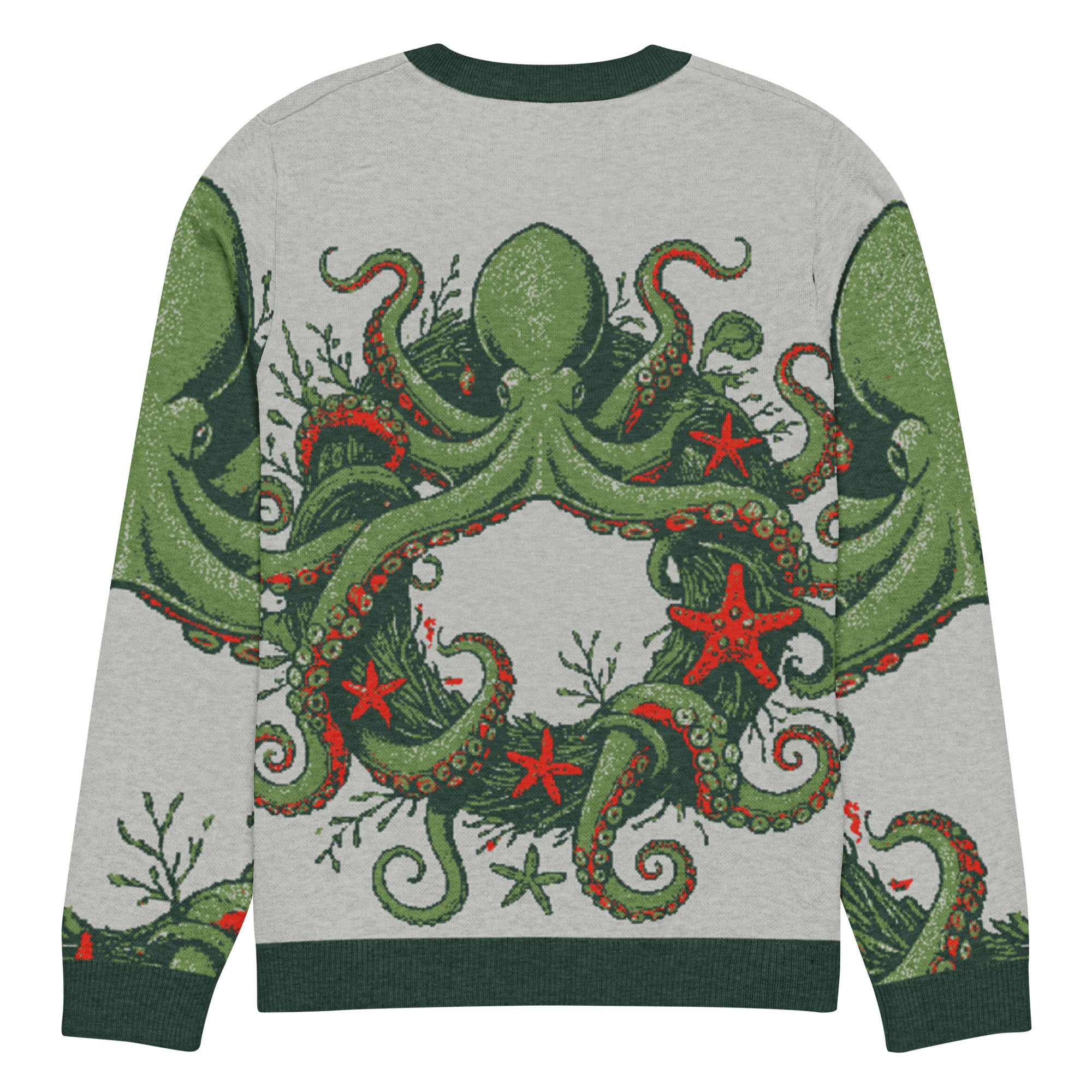 Add a splash of the ocean to your holiday wardrobe with this cozy, eco-friendly Classic Fit Knitted Crew Neck Sweater, featuring a one-of-a-kind Octopus Wreath Design. This unique “ugly¨ sweater showcases a whimsical octopus, whose intricately detailed tentacles wrap tightly to form a festive circular wreath, adorned with kelp, starfish, and sea life. The design's simple yet striking color palette of red, green, white, and blue adds a festive touch, making it the perfect statement piece for the holiday season.