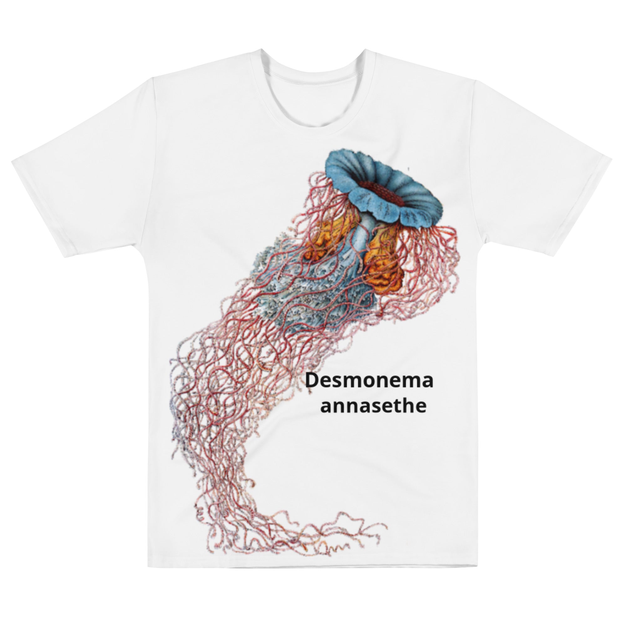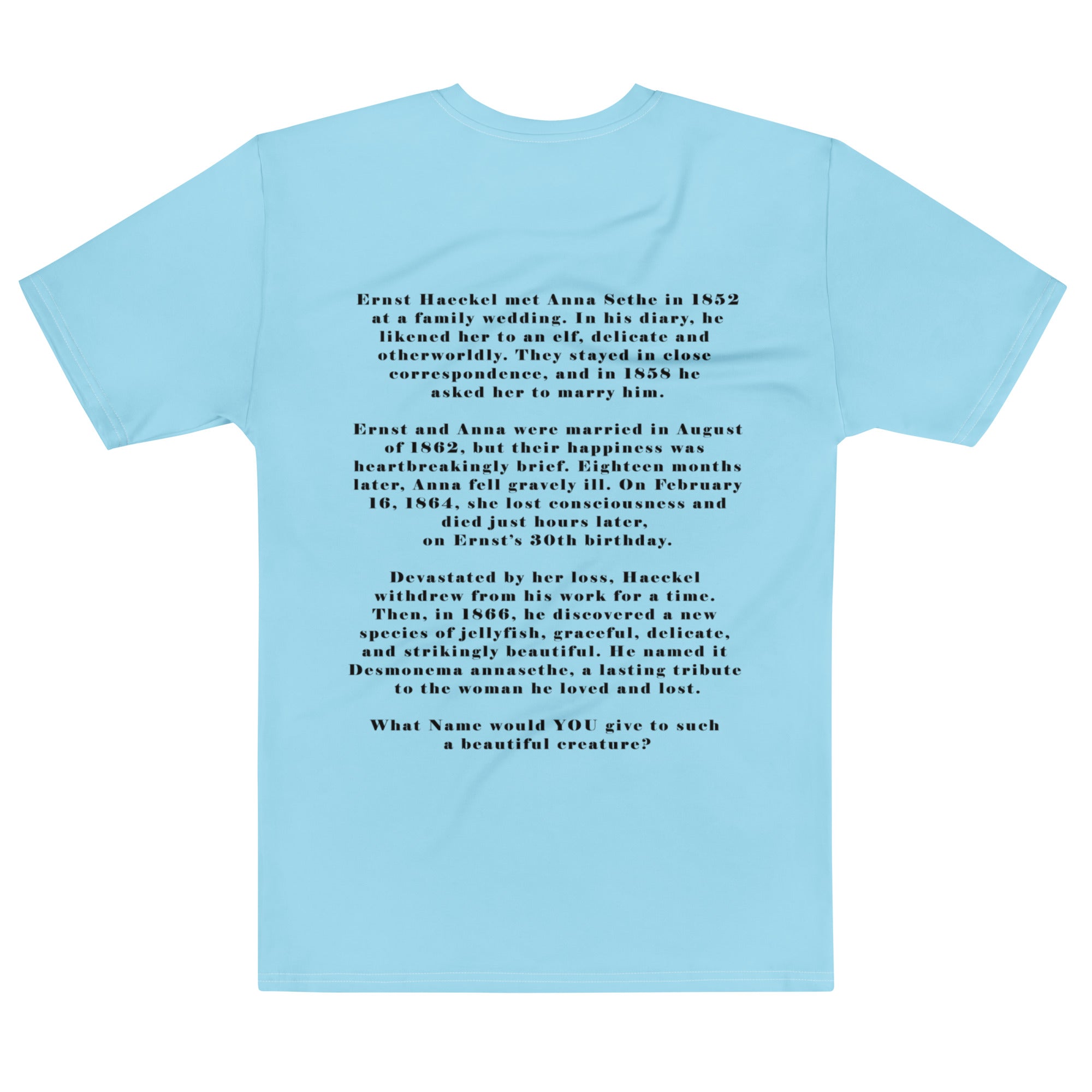 The back of the shirt recounts the story of Ernst Haeckel and his young bride, Anna Sethe. After Anna’s sudden death at just 28 years old, Haeckel was devastated. Years later, he discovered a jellyfish of striking delicacy and beauty. He named it Desmonema annasethe, ensuring that the woman he loved would be remembered—not only by him, but by science itself.